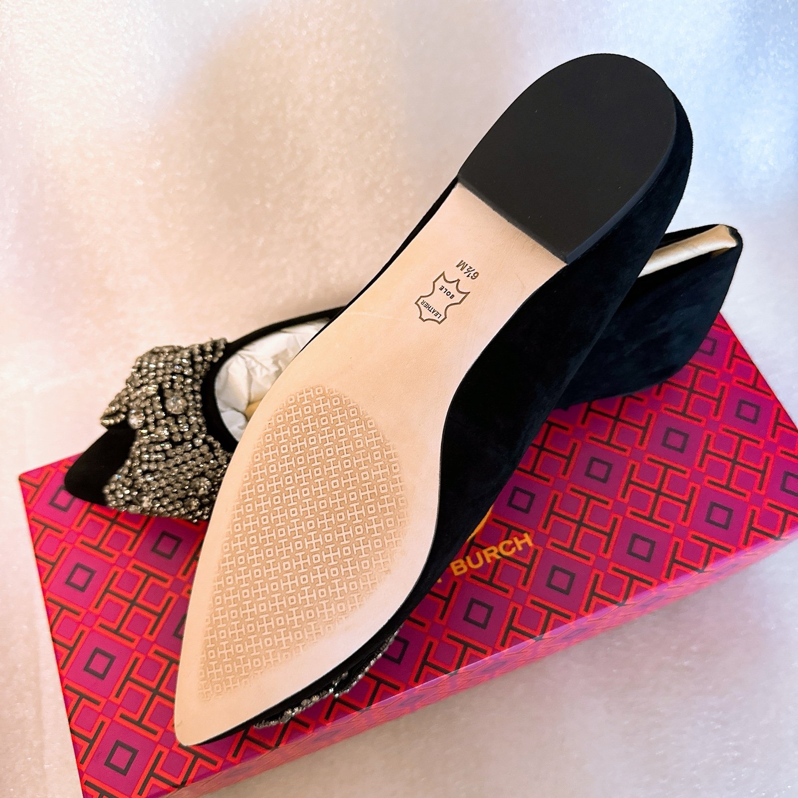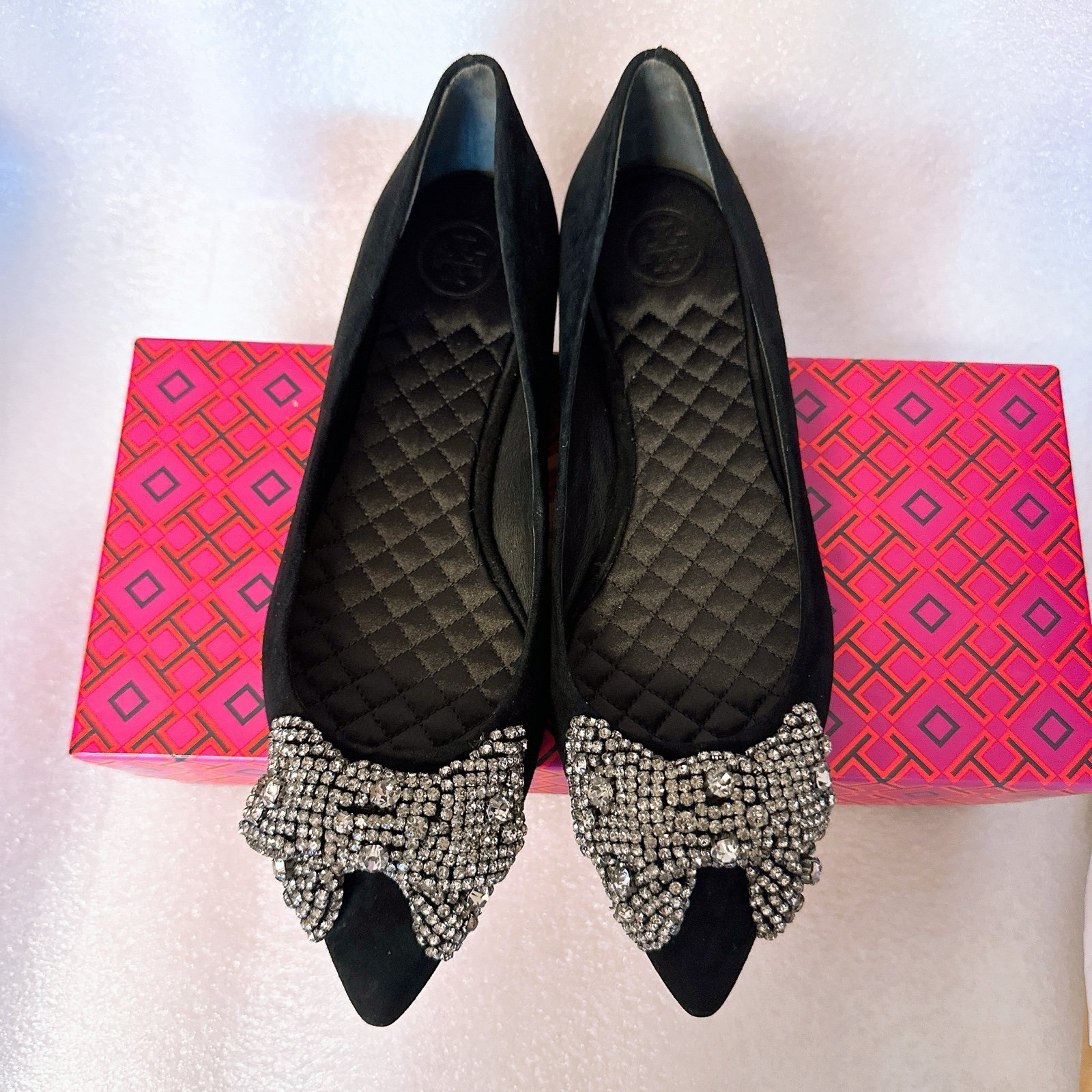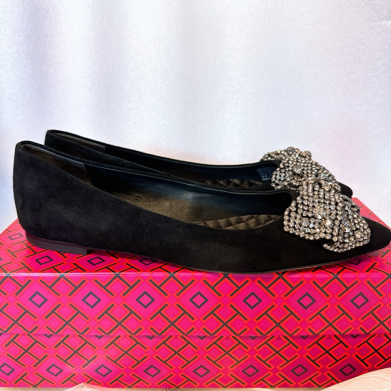 Tory Burch ESME FLAT Black Suede CRYSTAL Jeweled Bow Pointed Flats Size 6.5