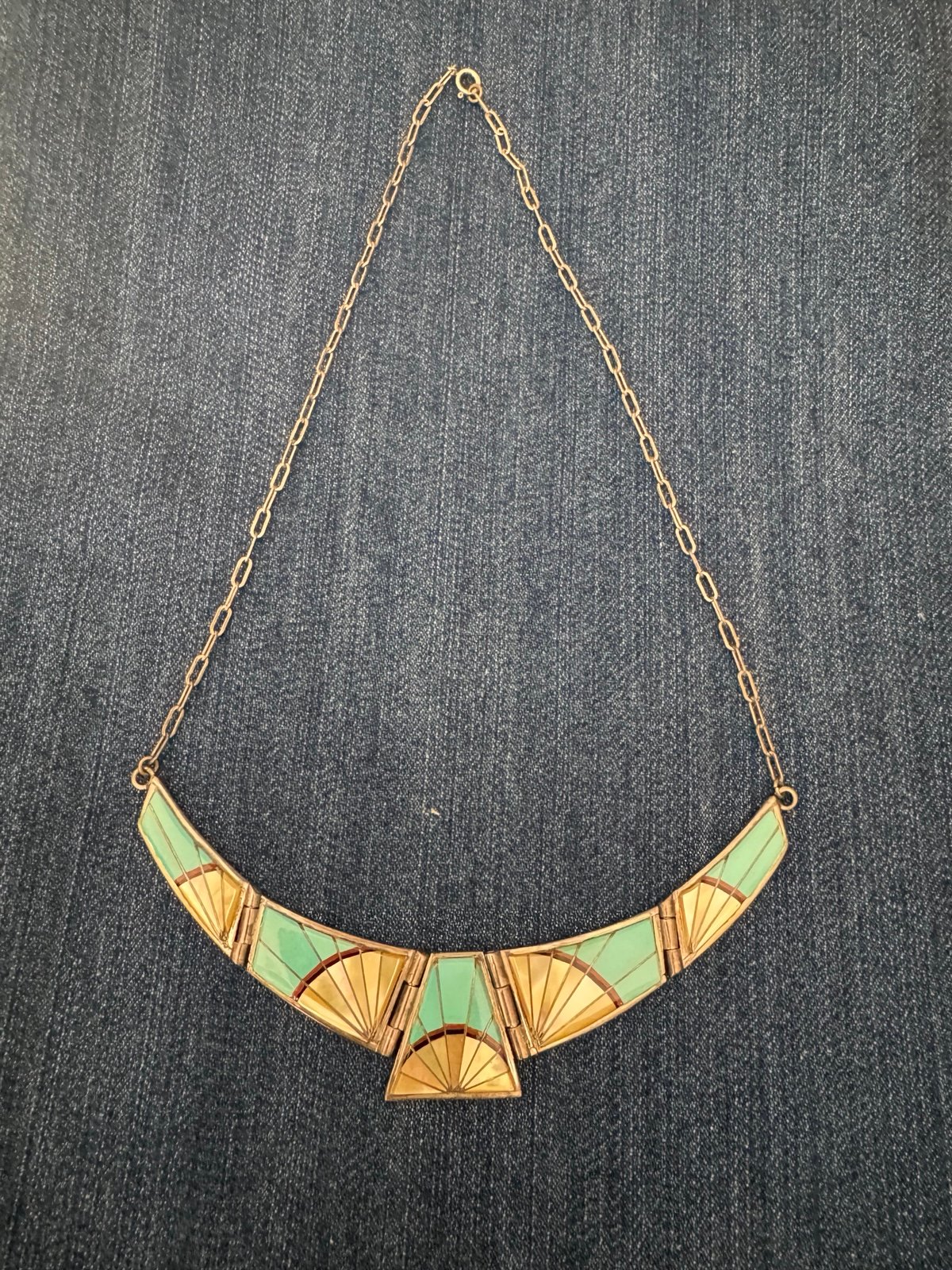 Exquisite Native American Sterling Silver Necklace with Geometric centerpiece featuring inlaid turquoise and mother of pearl in an art deco-inspired design.